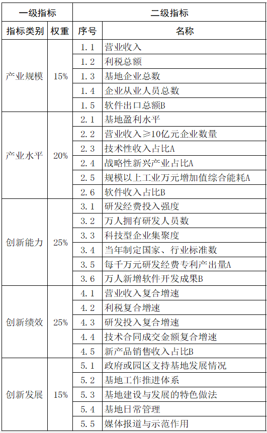 國家火炬產業基地評價指標體系設產業規模、產業水平、創新能力、創新績效、創新發展5個一級指標。二級指標設通用指標和專用指標。通用指標為特色產業基地和軟件產業基地共性指標,共19個。專用指標A類適用于特色產業基地,共4個;專用指標B類適用于軟件產業基地,共4個。